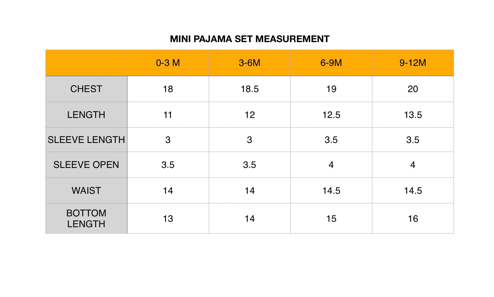 * Size - newborns upto 1 year.